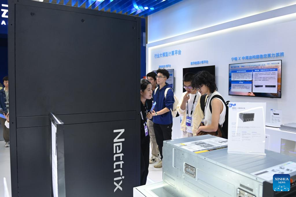 Visitors learn about a server product displayed at an exhibition during the 2023 Apsara Conference in Hangzhou, east China's Zhejiang Province, Oct. 31, 2023. The three-day Apsara Conference, formerly known as Ali cloud developers' conference, kicked off in Hangzhou on Tuesday. (Xinhua/Huang Zongzhi)