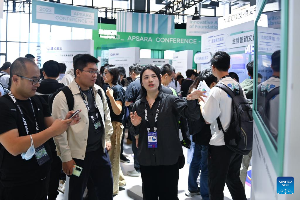 People learn about artificial intelligence (AI) products and their applications at an exhibition during the 2023 Apsara Conference in Hangzhou, east China's Zhejiang Province, Oct. 31, 2023. The three-day Apsara Conference, formerly known as Ali cloud developers' conference, kicked off in Hangzhou on Tuesday. (Xinhua/Huang Zongzhi)