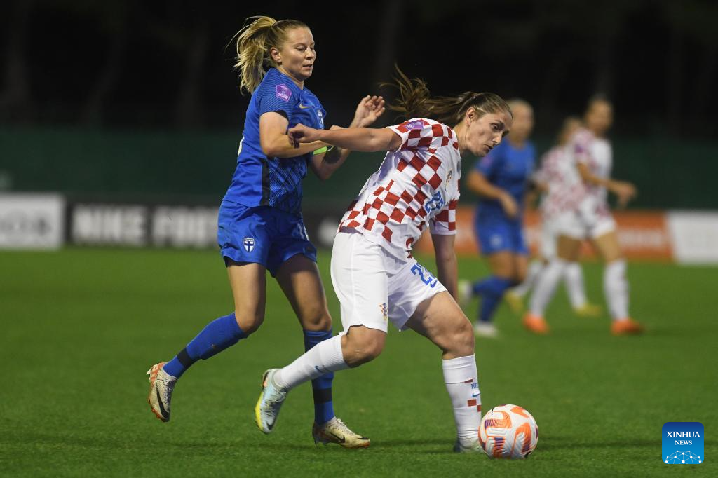 Heidi Kollanen (L) of Finland vies with Ruzica Krajinovic of Croatia during the UEFA Women's Nations League B, Group B2 match between Croatia and Finland in Sibenik, Croatia, on Oct. 31, 2023. (Photo by Hrvoje Jelavic/PIXSELL via Xinhua)