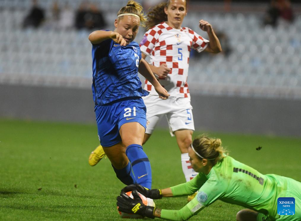 Goalkeeper of Croatia Doris Cacic (R) vies with Oona Sevenius of Finland during the UEFA Women's Nations League B, Group B2 match between Croatia and Finland in Sibenik, Croatia, on Oct. 31, 2023. (Photo by Hrvoje Jelavic/PIXSELL via Xinhua)