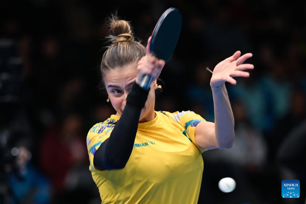 Adriana Diaz of Puerto Rico hits a return during the table tennis women's singles final between Bruna Takahashi of Brazil and Adriana Diaz of Puerto Rico at Pan American Games 2023, in Santiago, Chile, on Nov. 1, 2023. (Xinhua/Xin Yuewei)