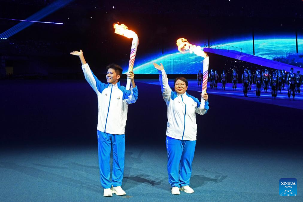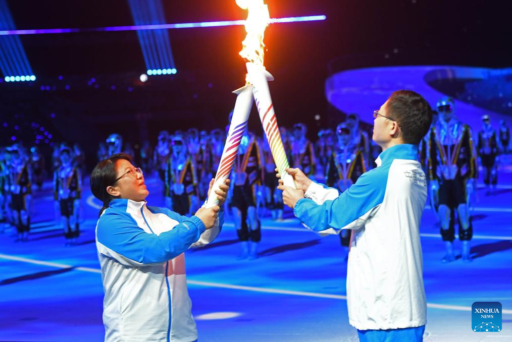Torch bearers Yang Ning (L) and Nie Shuangxi relay the torch during the opening ceremony of the first Student (Youth) Games of China in Nanning of south China's Guangxi Zhuang Autonomous Region on Nov. 5, 2023. (Xinhua/Hou Zhaokang)