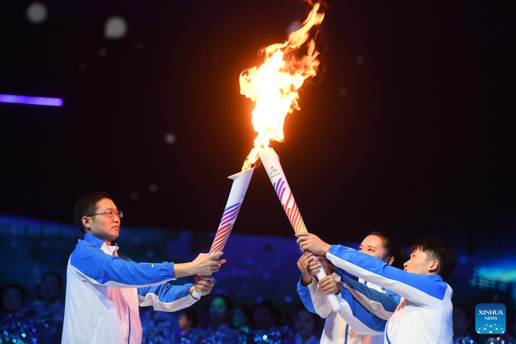 The cauldron is lit during the opening ceremony of the first Student (Youth) Games of China in Nanning of south China's Guangxi Zhuang Autonomous Region on Nov. 5, 2023. (Xinhua/Zhang Ailin)