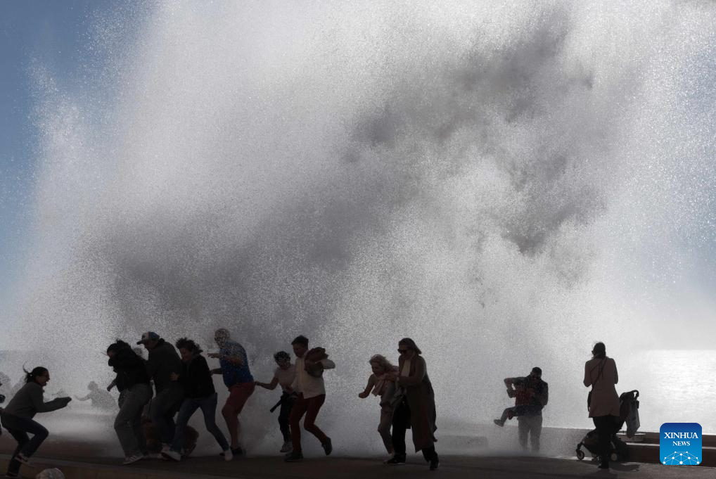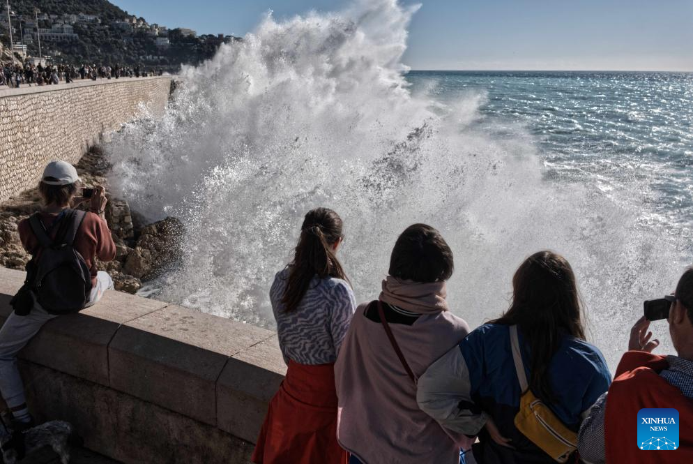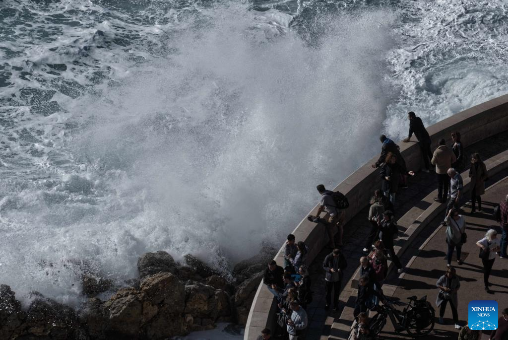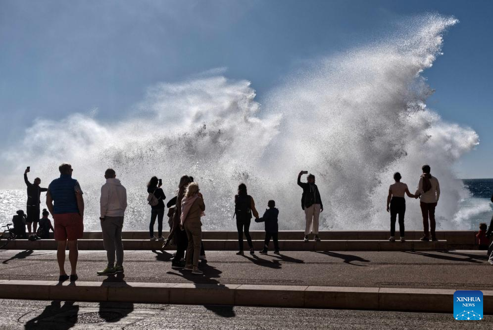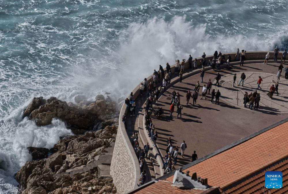 People watch huge waves along the coast in Nice, southern France, Nov. 5, 2023. (Photo by Serge Haouzi/Xinhua)