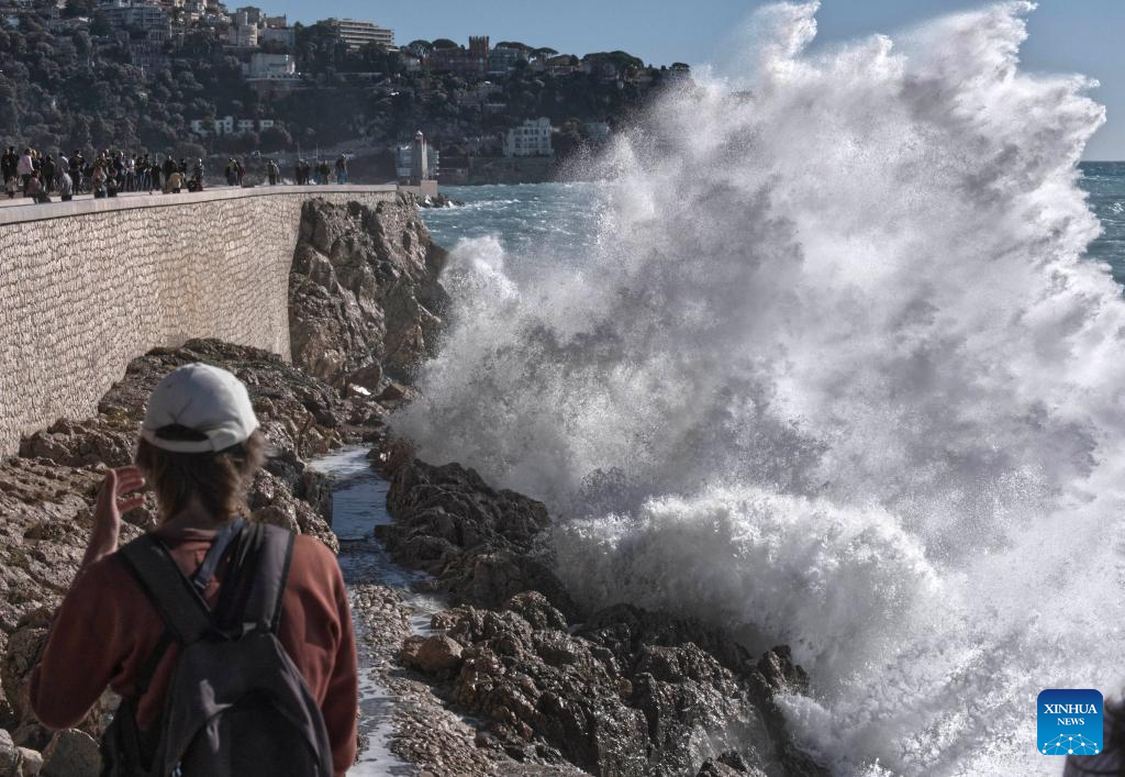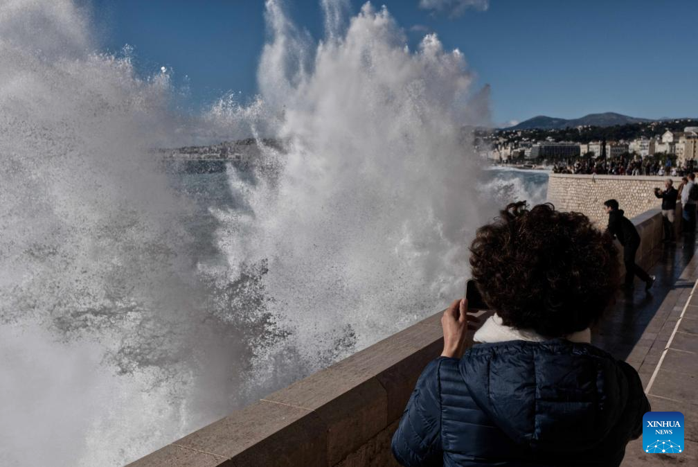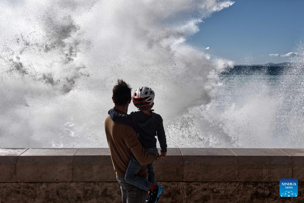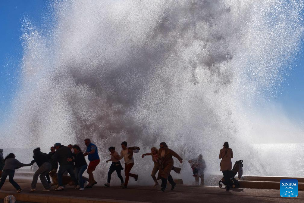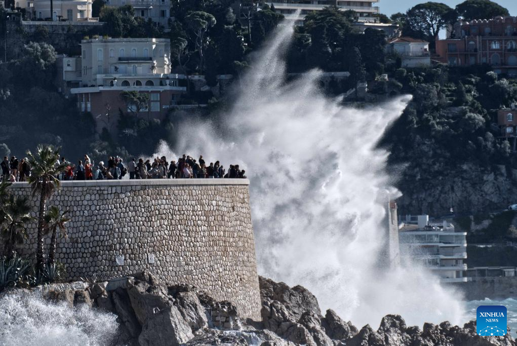 People watch huge waves along the coast in Nice, southern France, Nov. 5, 2023. (Photo by Serge Haouzi/Xinhua)