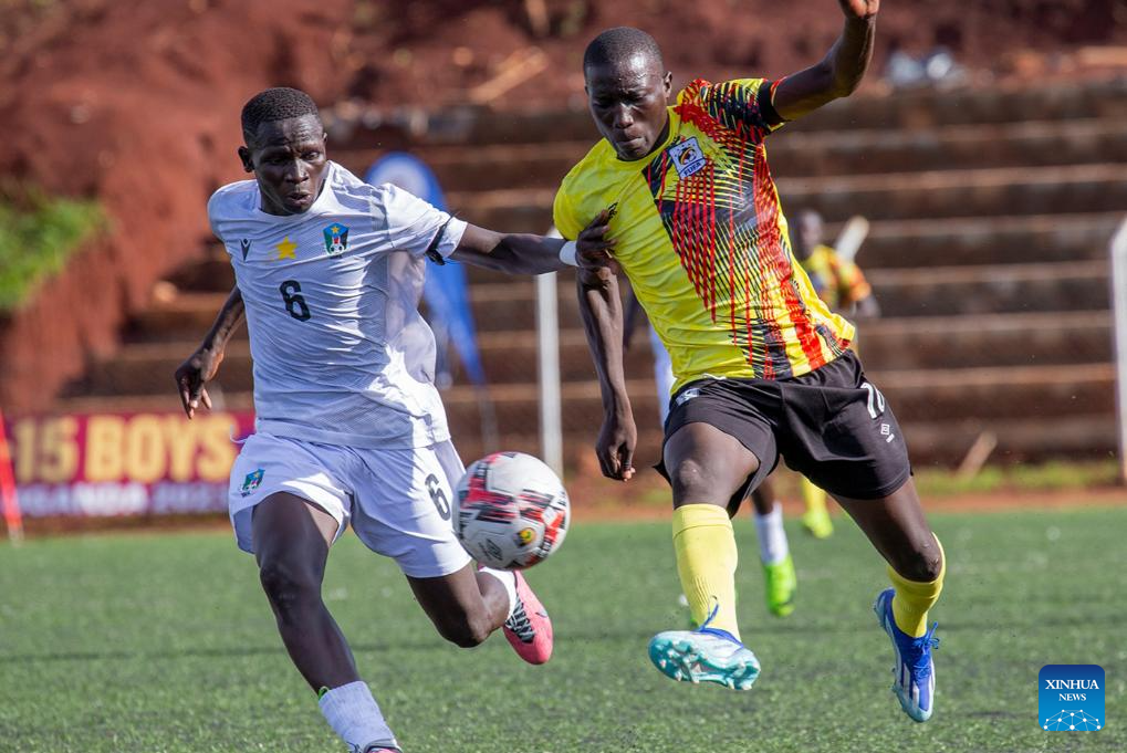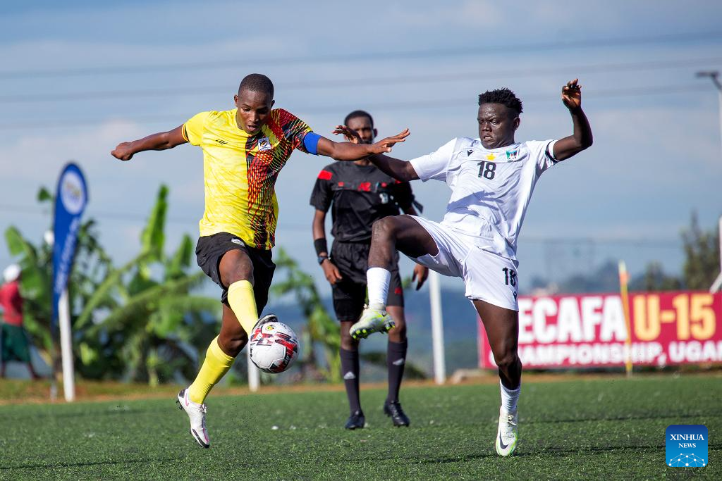 Felix Marial (L) of South Sudan and Arafat Nkoola of Uganda compete for the ball during the match between Uganda and South Sudan at the Council for East and Central Africa Football Associations (CECAFA) U15 Boys Championship in Buikwe District, Uganda, on Nov. 7, 2023. (Photo by Hajarah Nalwadda/Xinhua)
