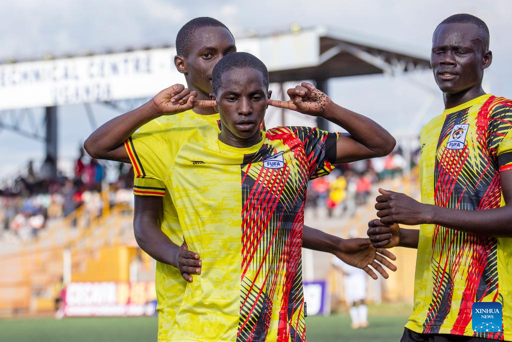 Frank Ssekanjako (L) of Uganda celebrates his goal with teammates during the match between Uganda and South Sudan at the Council for East and Central Africa Football Associations (CECAFA) U15 Boys Championship in Buikwe District, Uganda, on Nov. 7, 2023. (Photo by Hajarah Nalwadda/Xinhua)