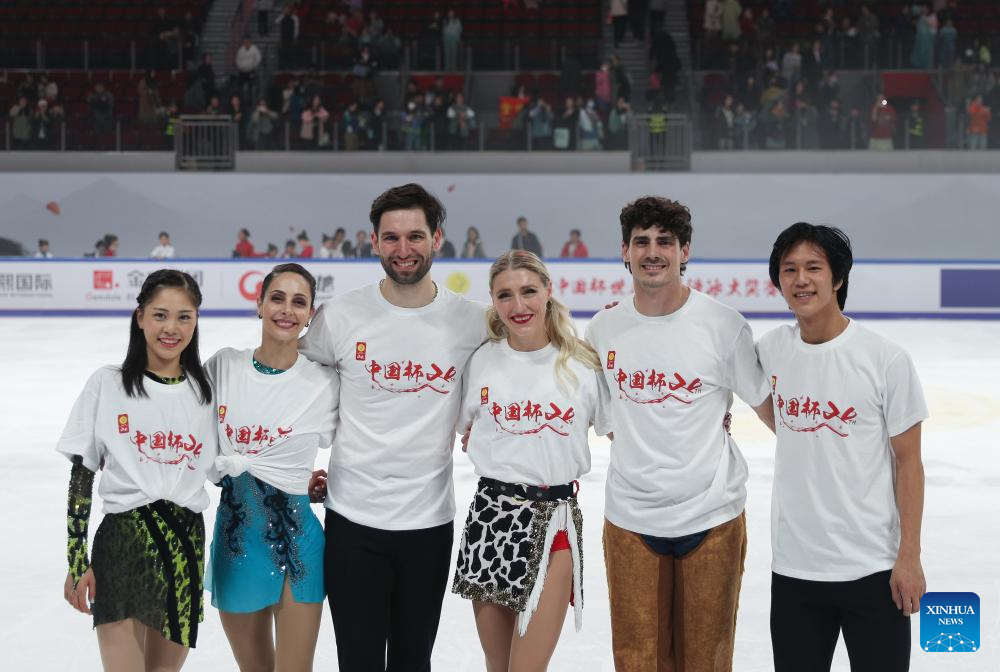 Piper Gilles (3rd R)/ Paul Poirier (2nd R) of Canada, Yoshida Hana (1st L) of Japan, Adam Siao Him Fa (1st R) of France, Deanna Stellato-Dudek (2nd L)/Maxime Deschamps of Canada pose for photos after the gala exhibition of the Cup of China ISU Grand Prix of Figure Skating 2023 in southwest China's Chongqing Municipality, Nov. 12, 2023. (Xinhua/Xu Yanan)