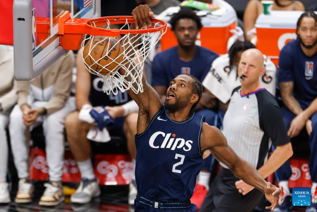 Kawhi Leonard (L) of Los Angeles Clippers dunks during the 2023-2024 NBA regular season match between Memphis Grizzlies and Los Angeles Clippers in Los Angeles, the United States, on Nov. 12, 2023. (Photo by Ringo Chiu/Xinhua)
