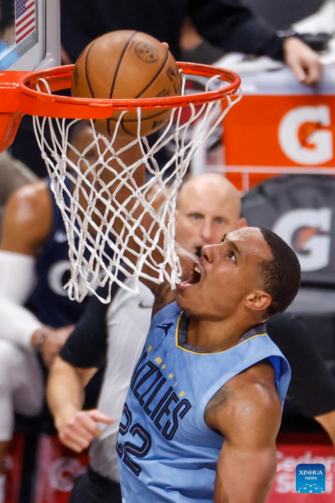 Desmond Bane of Memphis Grizzlies dunks during the 2023-2024 NBA regular season match between Memphis Grizzlies and Los Angeles Clippers in Los Angeles, the United States, on Nov. 12, 2023. (Photo by Ringo Chiu/Xinhua)