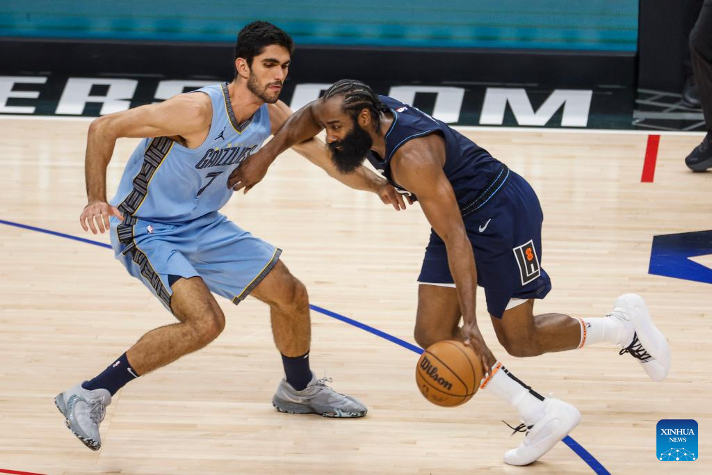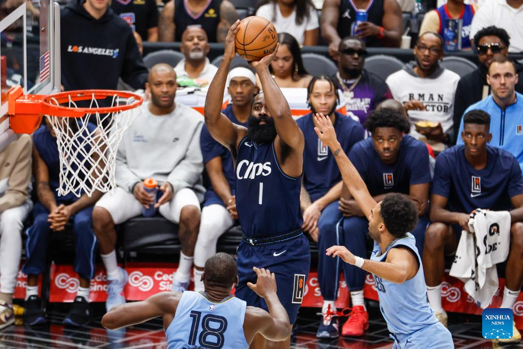 James Harden (R) of Los Angeles Clippers vies with Santi Aldama of Memphis Grizzlies during the 2023-2024 NBA regular season match between Memphis Grizzlies and Los Angeles Clippers in Los Angeles, the United States, on Nov. 12, 2023. (Photo by Ringo Chiu/Xinhua)