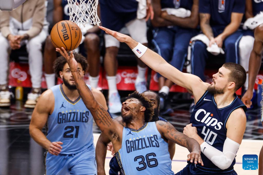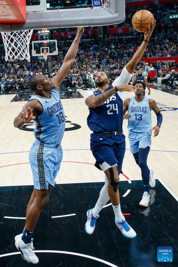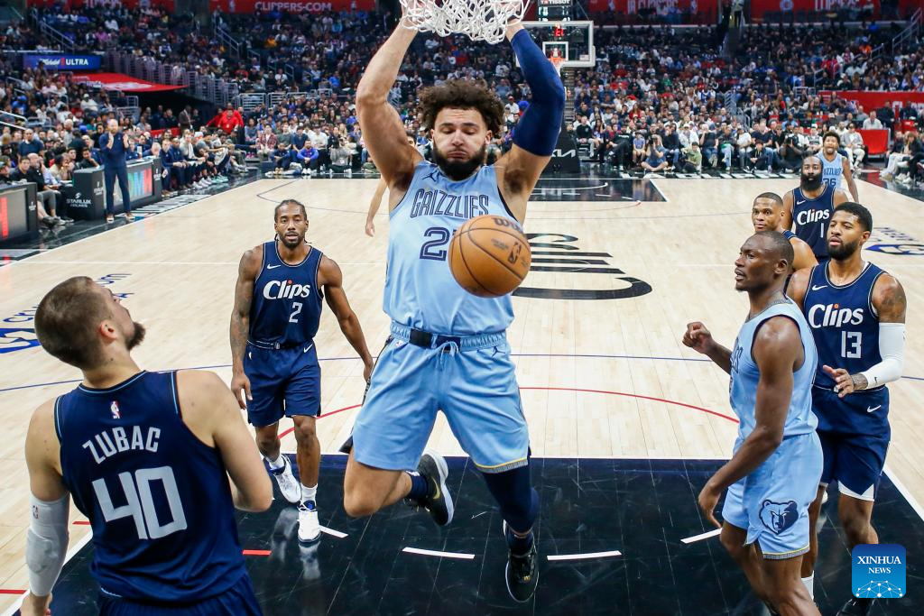 David Roddy (C) of Memphis Grizzlies dunks during the 2023-2024 NBA regular season match between Memphis Grizzlies and Los Angeles Clippers in Los Angeles, the United States, on Nov. 12, 2023. (Photo by Ringo Chiu/Xinhua)