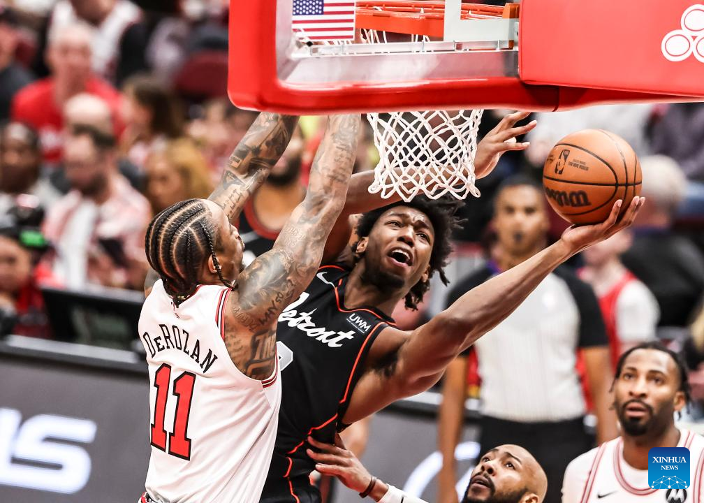 James Wiseman (2nd L) of Detroit Pistons vies with DeMar DeRozan (1st L) of Chicago Bulls during the 2023-2024 NBA regular season match between Detroit Pistons and Chicago Bulls in Chicago, the United States, on Nov. 12, 2023. (Photo by Joel Lerner/Xinhua)