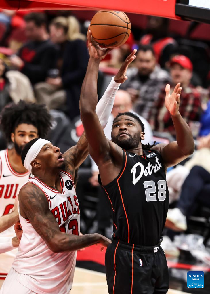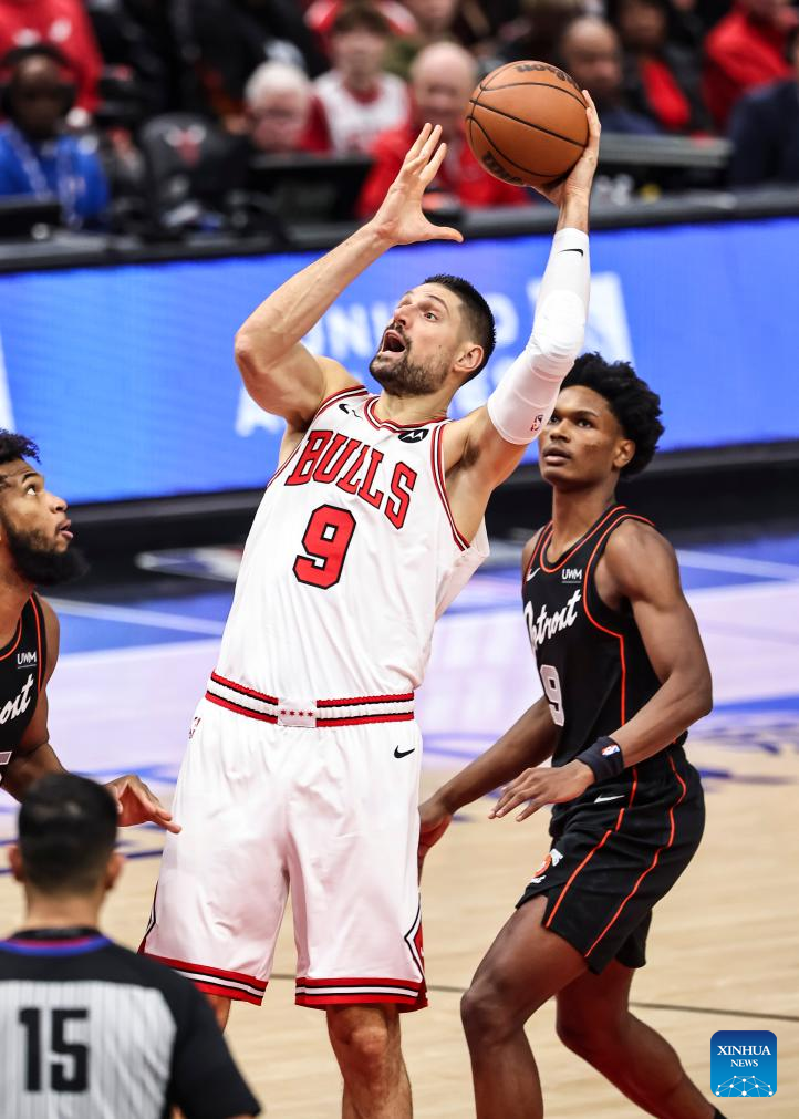 Nikola Vucevic (C) of Chicago Bulls shoots during the 2023-2024 NBA regular season match between Detroit Pistons and Chicago Bulls in Chicago, the United States, on Nov. 12, 2023. (Photo by Joel Lerner/Xinhua)