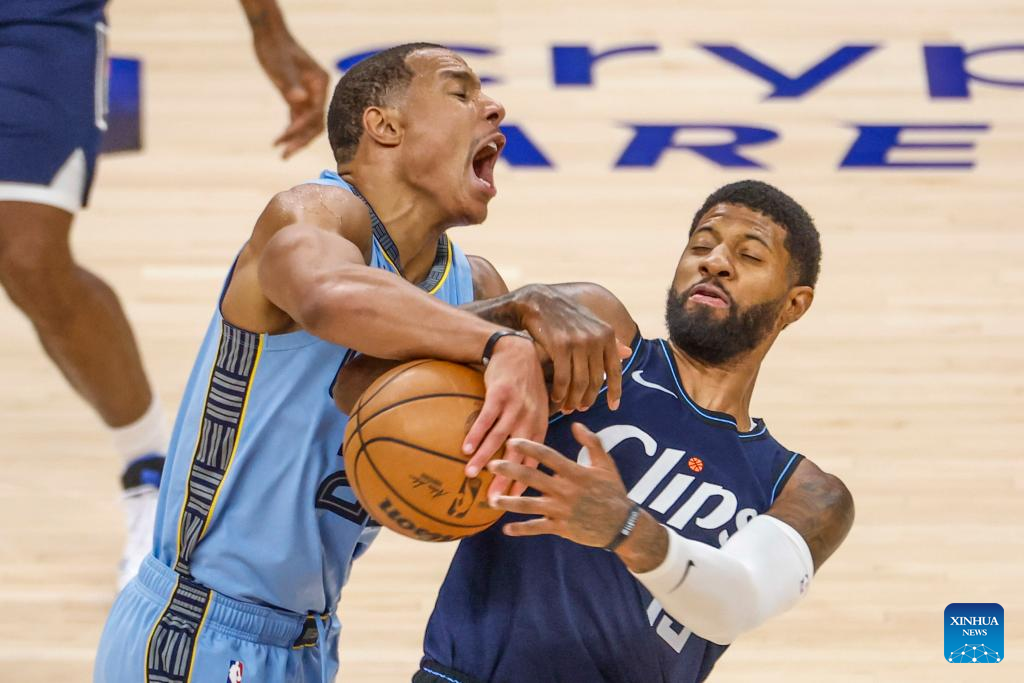Desmond Bane (L) of Memphis Grizzlies vies with Paul George of Los Angeles Clippers during the 2023-2024 NBA regular season match between Memphis Grizzlies and Los Angeles Clippers in Los Angeles, the United States, on Nov. 12, 2023. (Photo by Ringo Chiu/Xinhua)