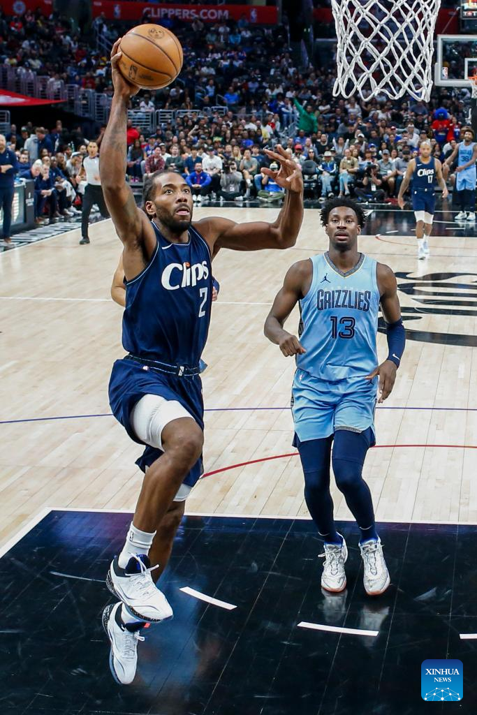 Kawhi Leonard (L) of Los Angeles Clippers goes for a lay-up during the 2023-2024 NBA regular season match between Memphis Grizzlies and Los Angeles Clippers in Los Angeles, the United States, on Nov. 12, 2023. (Photo by Ringo Chiu/Xinhua)