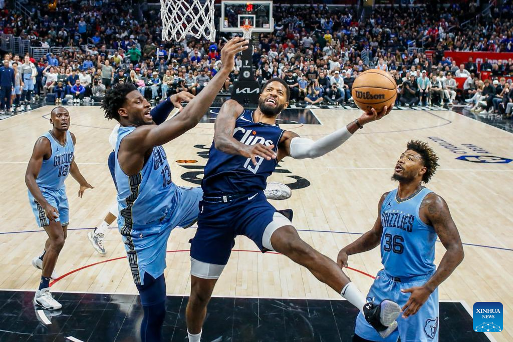Paul George (2nd R) of Los Angeles Clipper goes for a lay-up during the 2023-2024 NBA regular season match between Memphis Grizzlies and Los Angeles Clippers in Los Angeles, the United States, on Nov. 12, 2023. (Photo by Ringo Chiu/Xinhua)