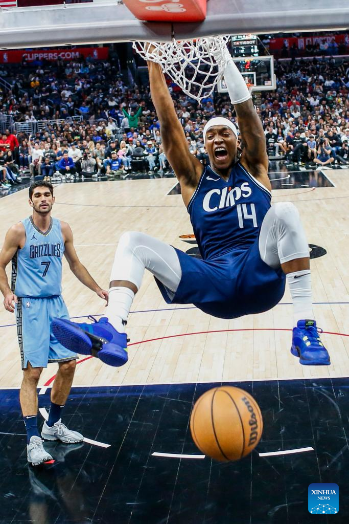Terance Mann (R) of Los Angeles Clippers dunks during the 2023-2024 NBA regular season match between Memphis Grizzlies and Los Angeles Clippers in Los Angeles, the United States, on Nov. 12, 2023. (Photo by Ringo Chiu/Xinhua)