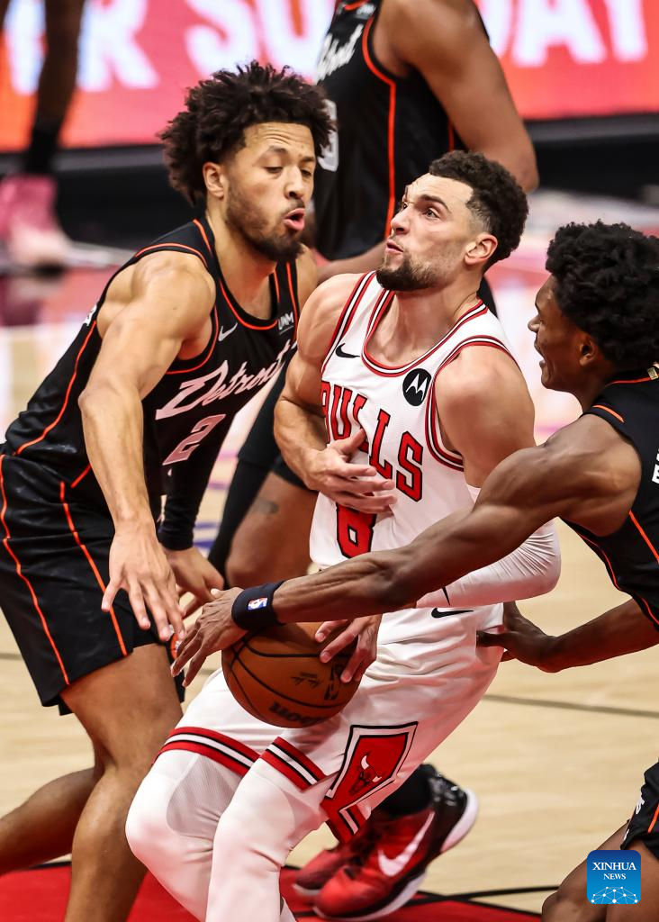 Zach LaVine (2nd R) of Chicago Bulls vies with Cade Cunningham (1st L) of Detroit Pistons during the 2023-2024 NBA regular season match between Detroit Pistons and Chicago Bulls in Chicago, the United States, on Nov. 12, 2023. (Photo by Joel Lerner/Xinhua)