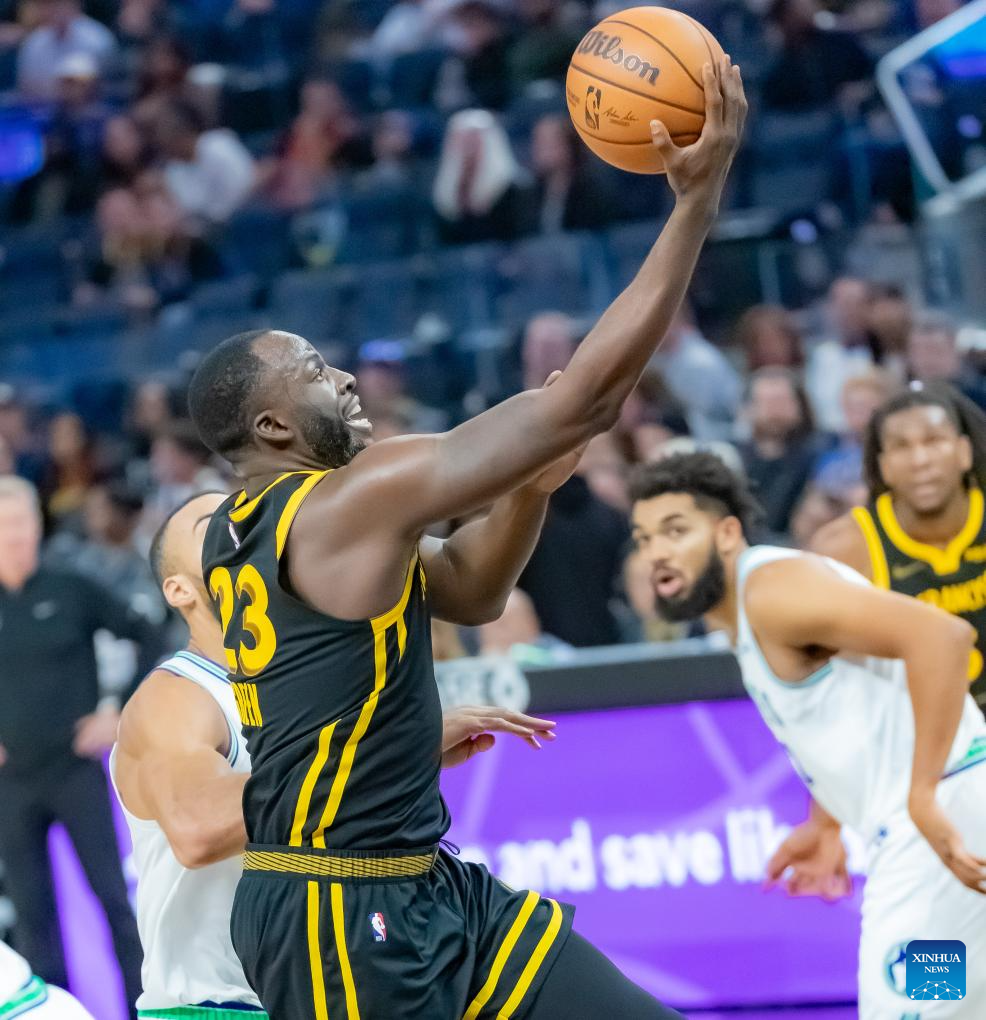 Draymond Green (F) of Golden State Warriors goes up for a lay-up during the 2023-2024 NBA regular season match between Minnesota Timberwolves and Golden State Warriors in San Francisco, California, the United States, on Nov. 12, 2023. (Photo by Arthur Dong/Xinhua)