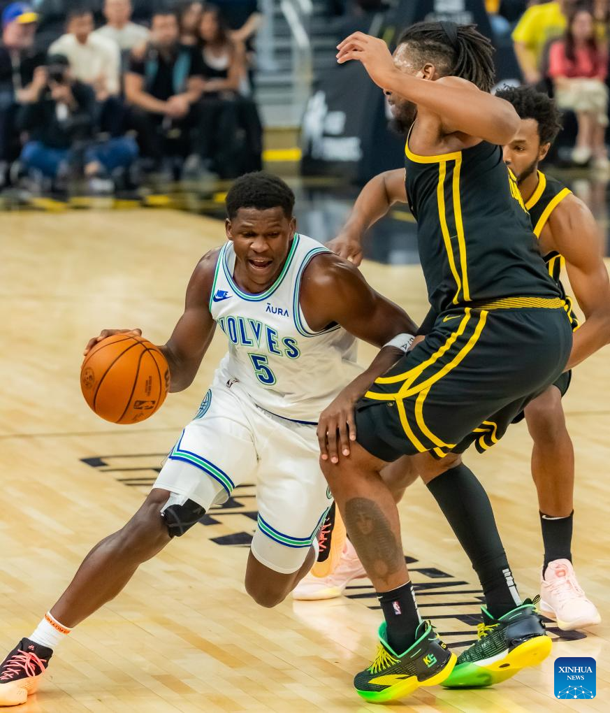 Anthony Edwards (L) of Minnesota Timberwolves breaks through during the 2023-2024 NBA regular season match between Minnesota Timberwolves and Golden State Warriors in San Francisco, California, the United States, on Nov. 12, 2023. (Photo by Arthur Dong/Xinhua)