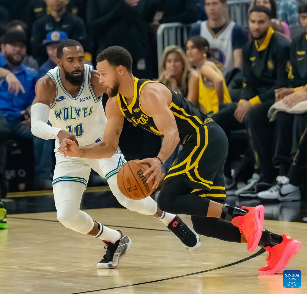 Stephen Curry (R) of Golden State Warriors breaks through during the 2023-2024 NBA regular season match between Minnesota Timberwolves and Golden State Warriors in San Francisco, California, the United States, on Nov. 12, 2023. (Photo by Arthur Dong/Xinhua)