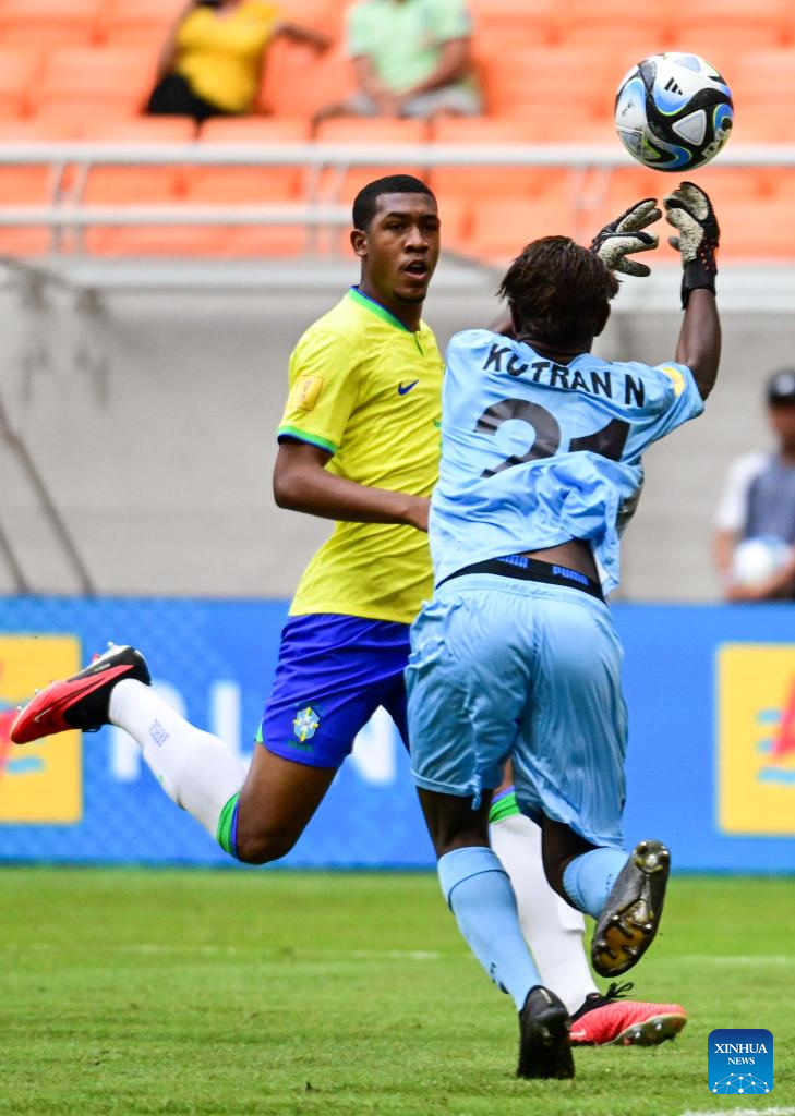 Rayan Victor Simplicio Rocha (R) of Brazil shoots during the group C match of the FIFA World Cup U17 between Brazil and New Caledonia at the Jakarta International Stadium in Jakarta, Indonesia, Nov 14, 2023. (Xinhua/Zulkarnain)