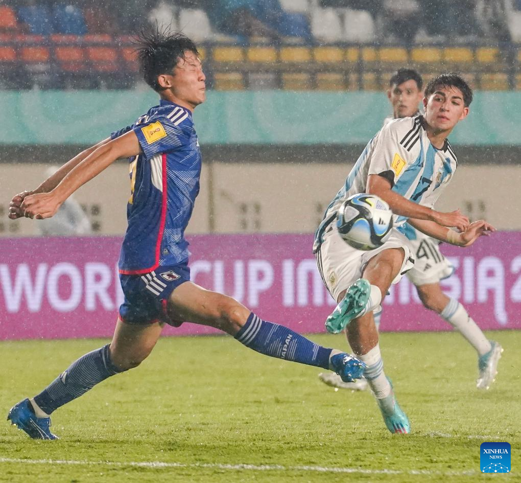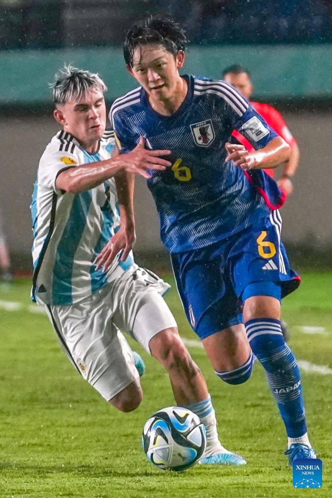 Yamamoto Joi (R) of Japan competes during the group D match between Japan and Argentina at the FIFA U17 World Cup in Bandung, Indonesia, on Nov. 14, 2023. (Photo by Septianjar Muharam/Xinhua)