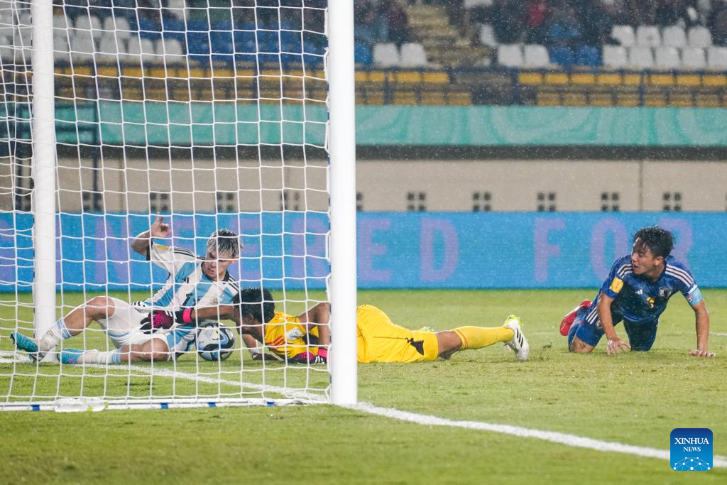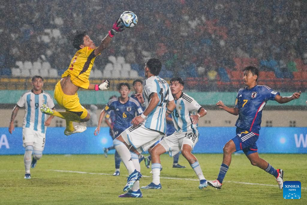Goalkeeper Goto Wataru (2nd L) of Japan makes a save during the group D match between Japan and Argentina at the FIFA U17 World Cup in Bandung, Indonesia, on Nov. 14, 2023. (Photo by Septianjar Muharam/Xinhua)