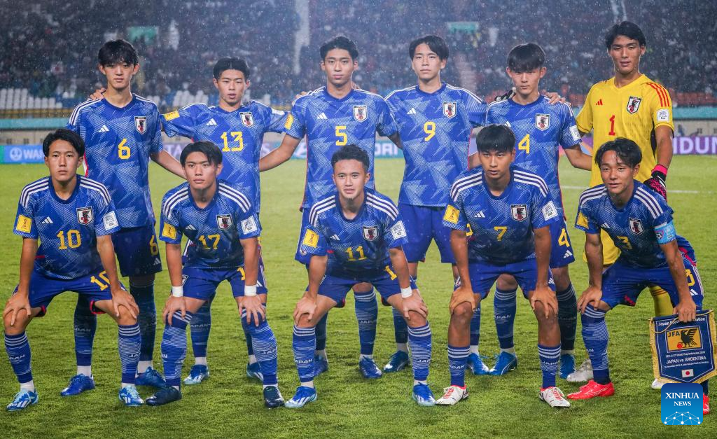 Starting players of Japan line up prior to the group D match between Japan and Argentina at the FIFA U17 World Cup in Bandung, Indonesia, on Nov. 14, 2023. (Photo by Septianjar Muharam/Xinhua)