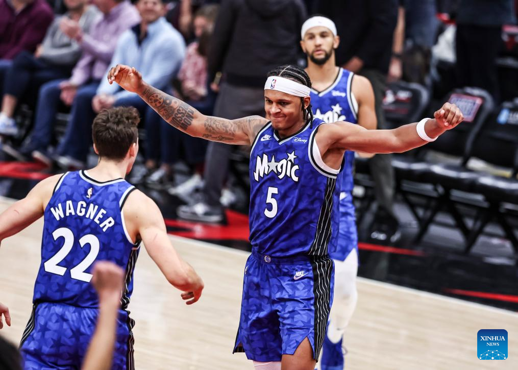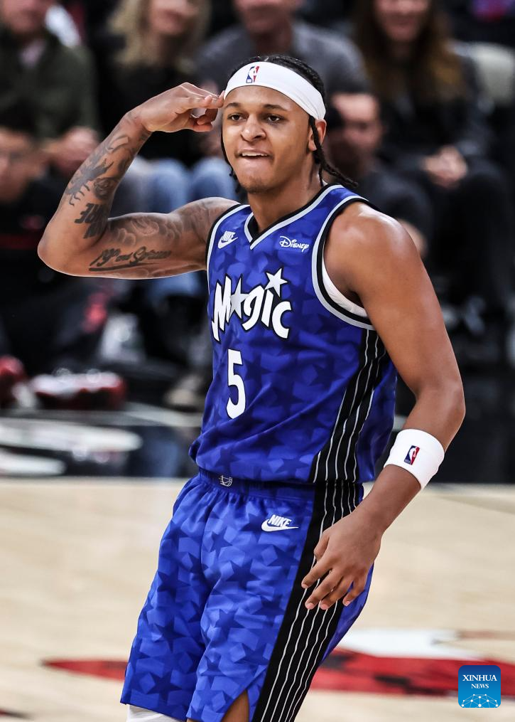 Orlando Magic's Paolo Banchero celebrates during NBA regular season game between the Orlando Magic and the Chicago Bulls at United Center in Chicago, U.S. state of Illinois, on Nov. 15, 2023. (Photo by Joel Lerner/Xinhua)