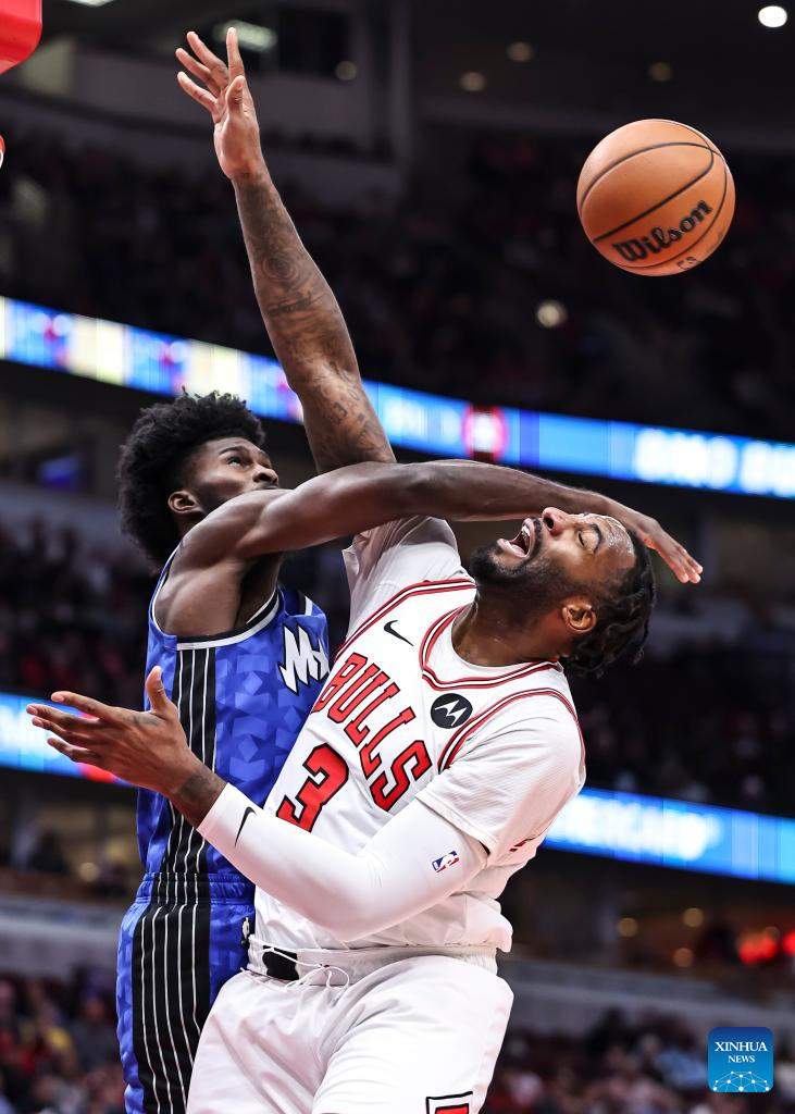 Chicago Bulls' Andre Drummond (L) gets fouled by Orlando Magic's Jonathan Isaac (R) during NBA regular season game between the Orlando Magic and the Chicago Bulls at United Center in Chicago, U.S. state of Illinois, on Nov. 15, 2023. (Photo by Joel Lerner/Xinhua)