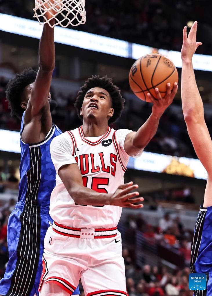 Chicago Bulls' Julian Phillips (C) drives to the basket during NBA regular season game between the Orlando Magic and the Chicago Bulls at United Center in Chicago, U.S. state of Illinois, on Nov. 15, 2023. (Photo by Joel Lerner/Xinhua)