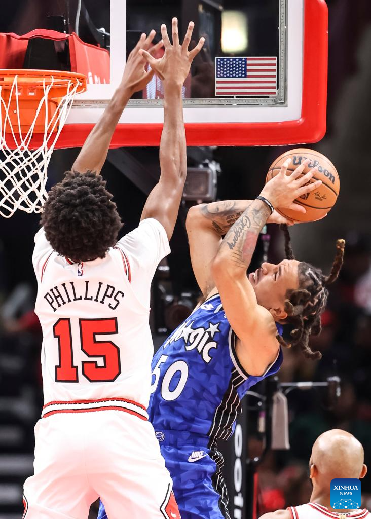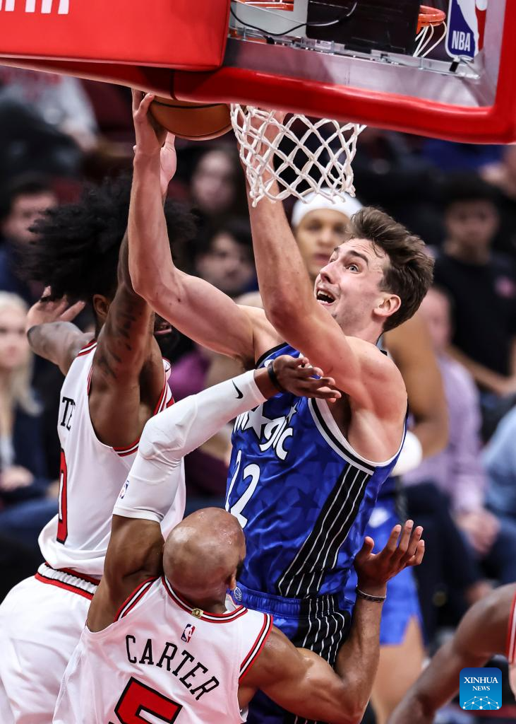 Orlando Magic's Franz Wagner (R) drives to the basket during NBA regular season game between the Orlando Magic and the Chicago Bulls at United Center in Chicago, U.S. state of Illinois, on Nov. 15, 2023. (Photo by Joel Lerner/Xinhua)