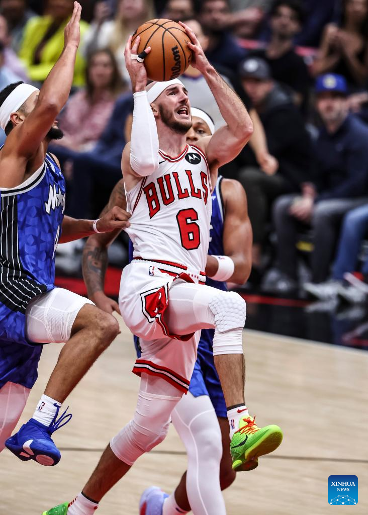 Chicago Bulls' Alex Caruso (C) goes up to the basket during NBA regular season game between the Orlando Magic and the Chicago Bulls at United Center in Chicago, U.S. state of Illinois, on Nov. 15, 2023. (Photo by Joel Lerner/Xinhua)