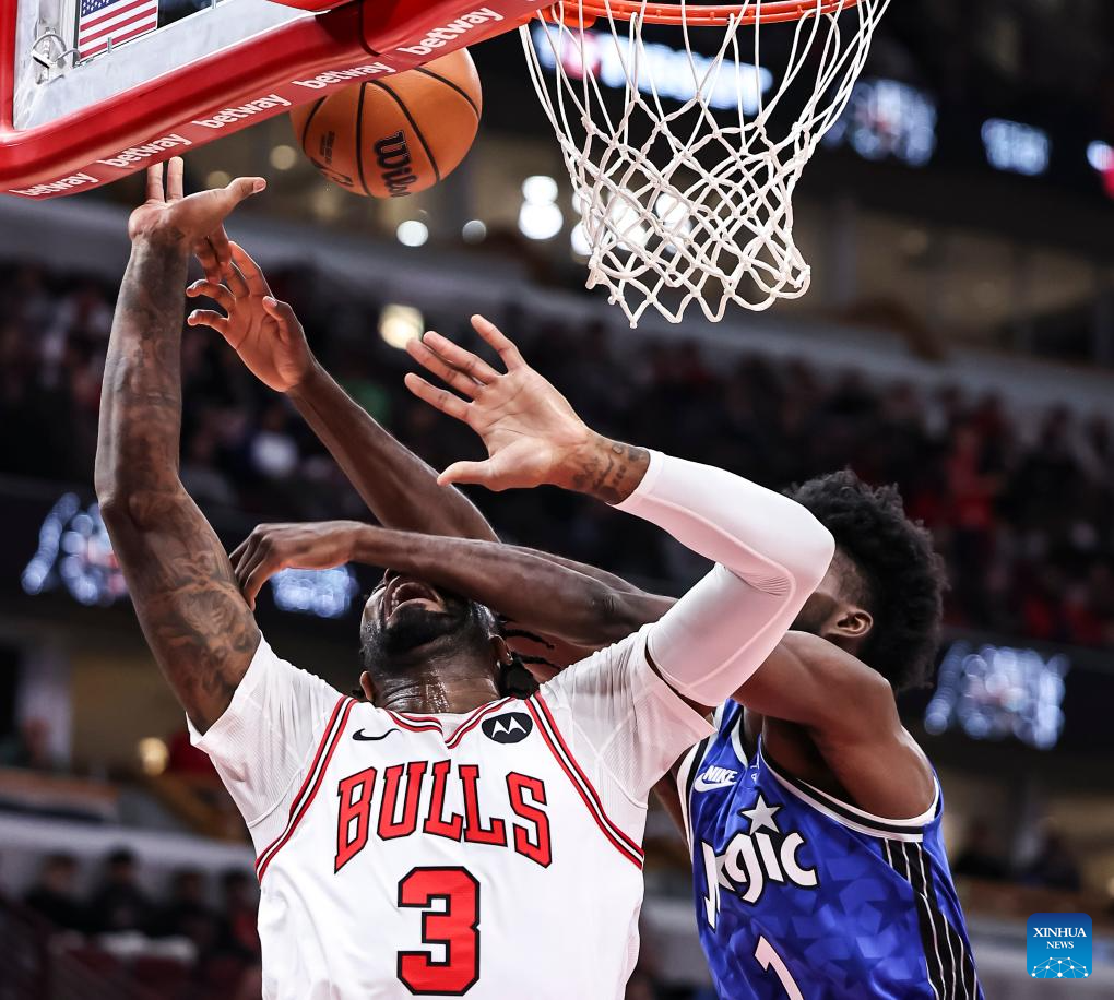 Chicago Bulls' Zach LaVine (R) drives to the basket during NBA regular season game between the Orlando Magic and the Chicago Bulls at United Center in Chicago, U.S. state of Illinois, on Nov. 15, 2023. (Photo by Joel Lerner/Xinhua)