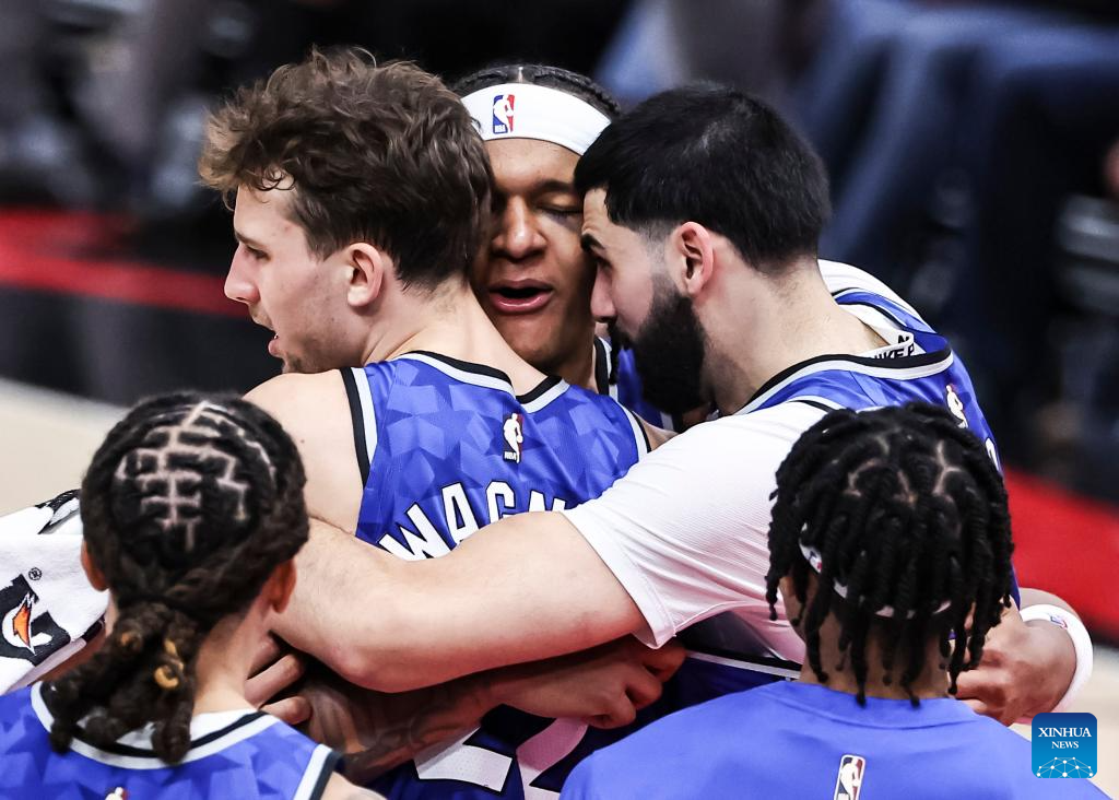 Orlando Magic's Paolo Banchero (C) celebrates hitting the game winning shot during NBA regular season game between the Orlando Magic and the Chicago Bulls at United Center in Chicago, U.S. state of Illinois, on Nov. 15, 2023. (Photo by Joel Lerner/Xinhua)
