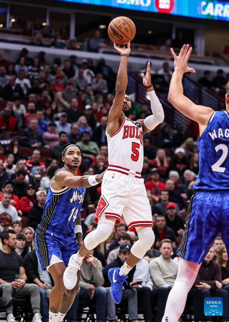 Chicago Bulls' Jevon Carter (C) shoots during NBA regular season game between the Orlando Magic and the Chicago Bulls at United Center in Chicago, U.S. state of Illinois, on Nov. 15, 2023. (Photo by Joel Lerner/Xinhua)