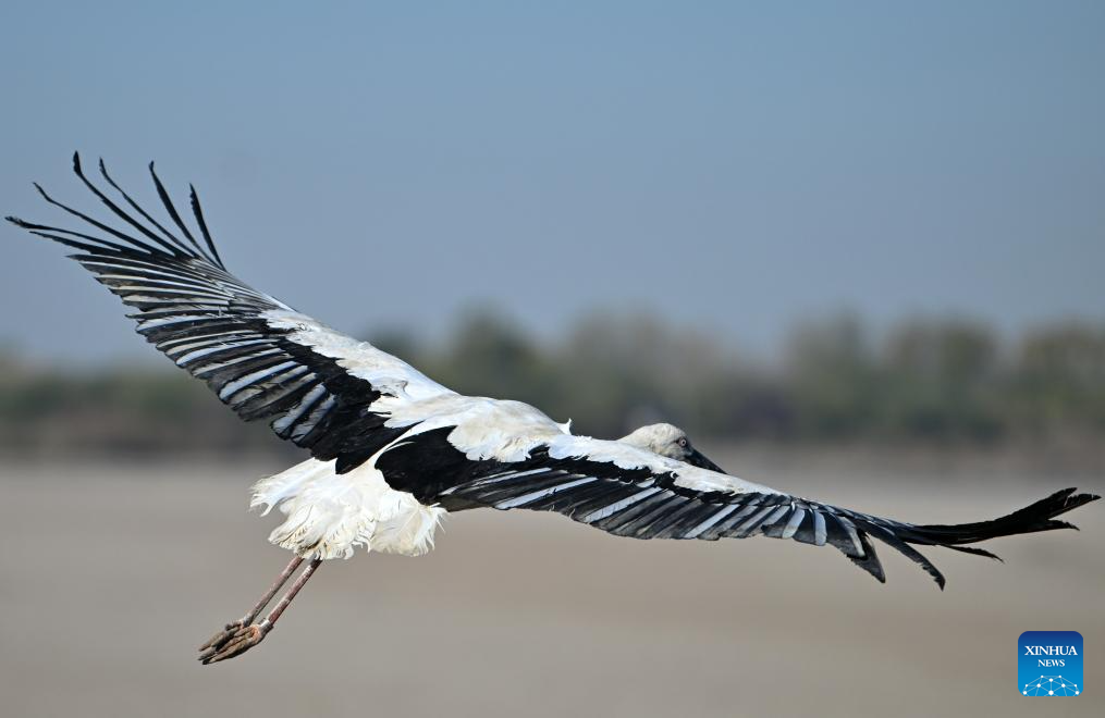 An oriental white stork glides at Qilihai Wetland in north China's Tianjin, Nov. 18, 2023. A total of 11 rescued oriental white storks and more than 100 other birds were released into the wild at Qilihai Wetland in north China's Tianjin on Saturday.