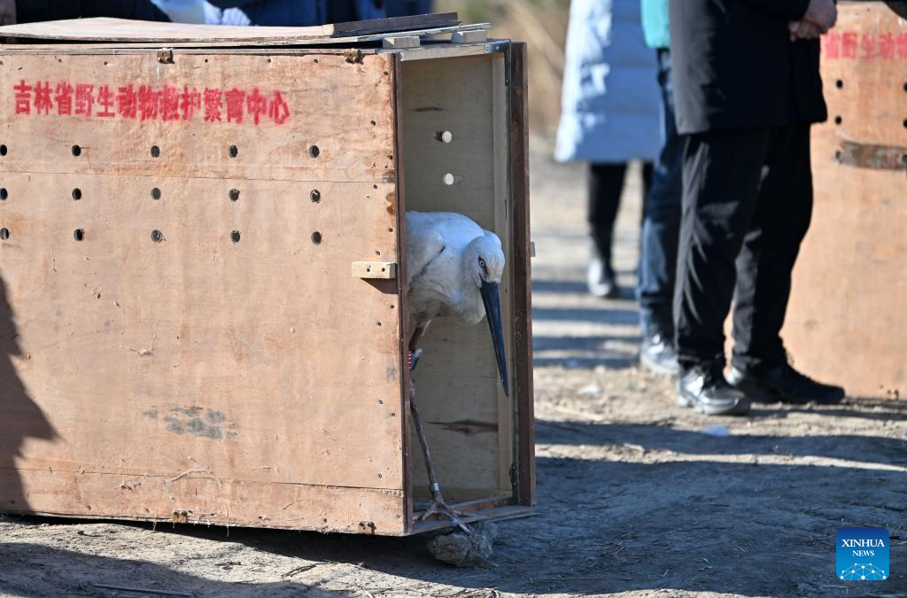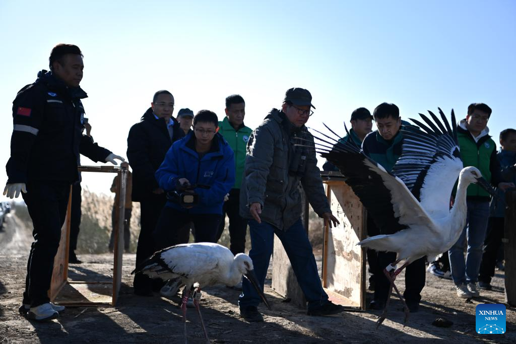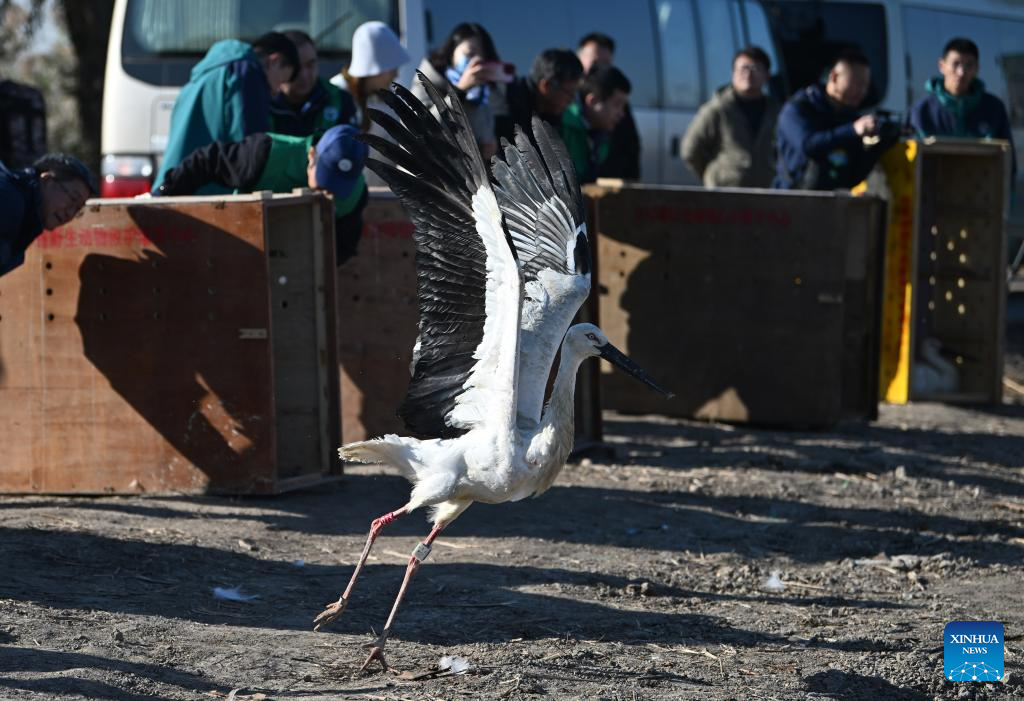 Staff members release oriental white storks into the wild at Qilihai Wetland in north China's Tianjin, Nov. 18, 2023. A total of 11 rescued oriental white storks and more than 100 other birds were released into the wild at Qilihai Wetland in north China's Tianjin on Saturday.