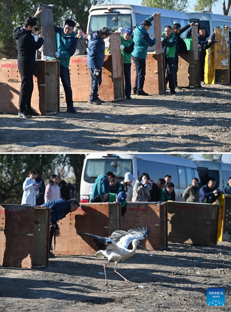 This combo photo shows staff members releasing oriental white storks into the wild at Qilihai Wetland in north China's Tianjin, Nov. 18, 2023. A total of 11 rescued oriental white storks and more than 100 other birds were released into the wild at Qilihai Wetland in north China's Tianjin on Saturday.