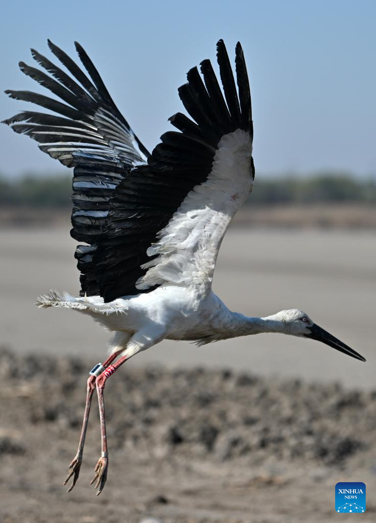 An oriental white stork takes off after being released at Qilihai Wetland in north China's Tianjin, Nov. 18, 2023. A total of 11 rescued oriental white storks and more than 100 other birds were released into the wild at Qilihai Wetland in north China's Tianjin on Saturday.