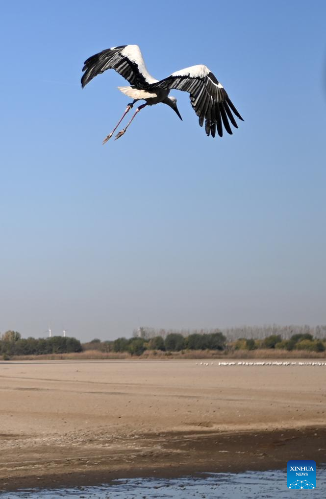 An oriental white stork flies to join the flocks of its kind at Qilihai Wetland in north China's Tianjin, Nov. 18, 2023. A total of 11 rescued oriental white storks and more than 100 other birds were released into the wild at Qilihai Wetland in north China's Tianjin on Saturday.