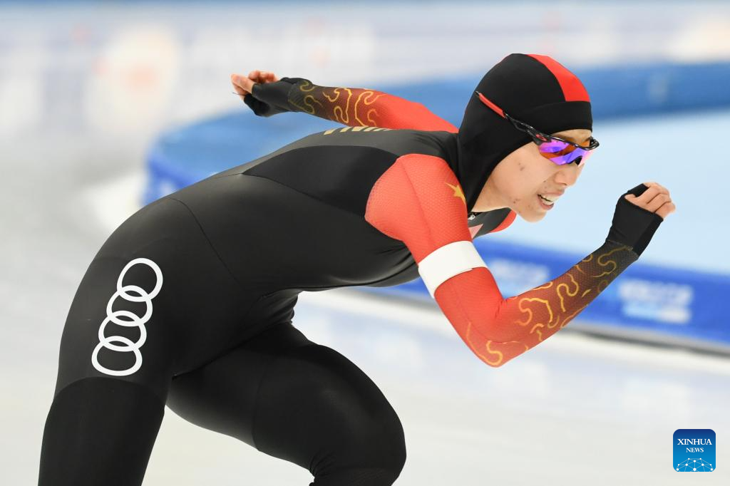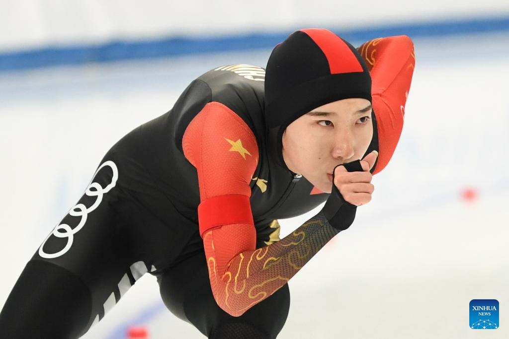Gao Tingyu of China competes during the 2nd 500m Men Division A on the Day 2 of ISU World Cup Speed Skating at National Speed Skating Oval in Beijing, capital of China, Nov. 18, 2023. (Xinhua/Ju Huanzong)