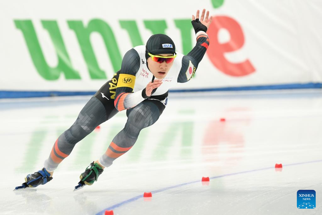 Morishige Wataru of Japan competes during the 2nd 500m Men Division A on the Day 2 of ISU World Cup Speed Skating at National Speed Skating Oval in Beijing, capital of China, Nov. 18, 2023. (Xinhua/Ju Huanzong)