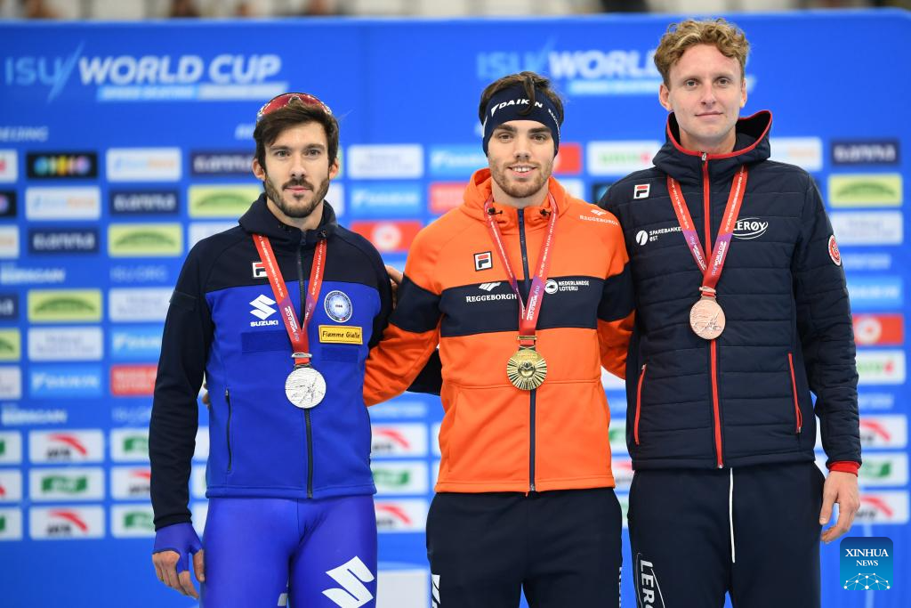 Gold medalist Patrick Roest (C) of the Netherlands, pose with silver medalist Davide Ghiotto (L) of Italy and bronze medalist Sander Eitrem of Norway during the awarding ceremony of the 5000m Men Division A on the Day 2 of ISU World Cup Speed Skating at National Speed Skating Oval in Beijing, capital of China, Nov. 18, 2023. (Xinhua/Ju Huanzong)