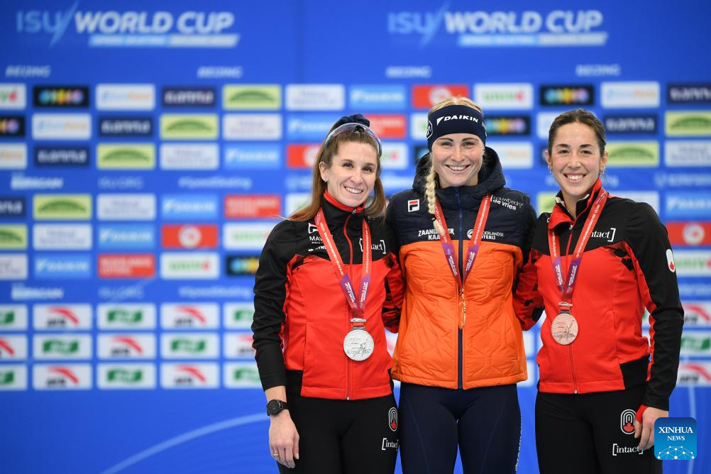 Gold medalist Marijke Groenewoud (C) of the Netherlands poses with silver medalist Ivanie Blondin (L) of Canada and bronze medalist Valerie Maltais of Canada during the awarding ceremony of the Mass Start Women Division A on the Day 2 of ISU World Cup Speed Skating at National Speed Skating Oval in Beijing, capital of China, Nov. 18, 2023. (Xinhua/Ju Huanzong)