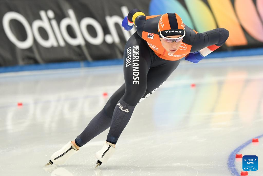 Jutta Leerdam of the Netherlands competes during the 1000m Women Division A on the Day 2 of ISU World Cup Speed Skating at National Speed Skating Oval in Beijing, capital of China, Nov. 18, 2023. (Xinhua/Ju Huanzong)