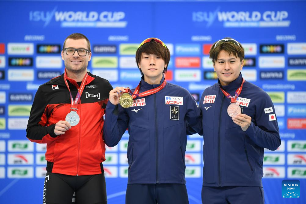 Gold medalist Morishige Wataru (C) of Japan pose with silver medalist Laurent Dubreuil (L) of Canada and bronze medalist Murakami Yuma during the awarding ceremony of the 2nd 500m Men Division A on the Day 2 of ISU World Cup Speed Skating at National Speed Skating Oval in Beijing, capital of China, Nov. 18, 2023. (Xinhua/Ju Huanzong)