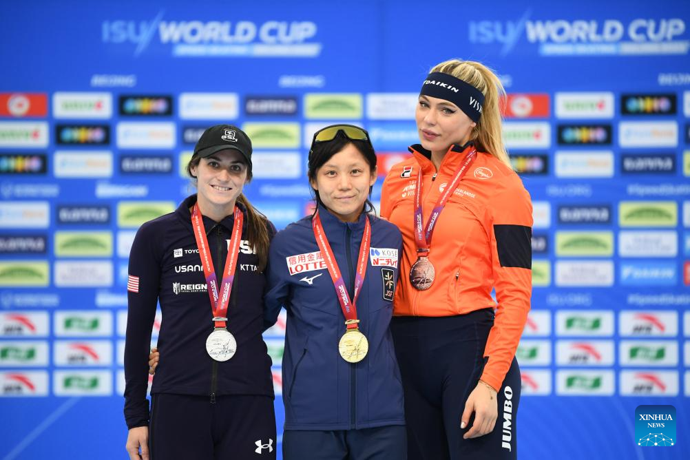 Gold medalist Takagi Miho (C) of Japan poses with silver medalist Kimi Goetz (L) of the United States and bronze medalist Jutta Leerdam of the Netherlands during the awarding ceremony of the 1000m Women Division A on the Day 2 of ISU World Cup Speed Skating at National Speed Skating Oval in Beijing, capital of China, Nov. 18, 2023. (Xinhua/Ju Huanzong)